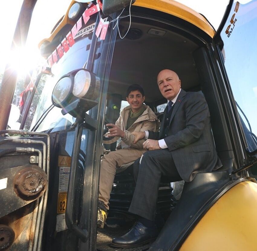 Büyükşehir Belediyesi binası önüne getirilen iş makinesine binen ve kendisine hediye edilen oyuncakla mutluluğunu ifade eden Furkan Susam’a Başkan Sekmen de eşlik etti.
