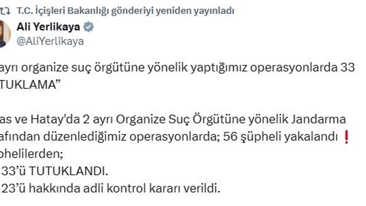 ANKARA, (DHA)- İÇİŞLERİ Bakanı Ali Yerlikaya, Sivas ve Hatay merkezli 10 ilde 2 ayrı organize suç örgütüne yönelik operasyonda 56 şüphelinin yakalandığını, 33'ünün tutuklandığını açıkladı.