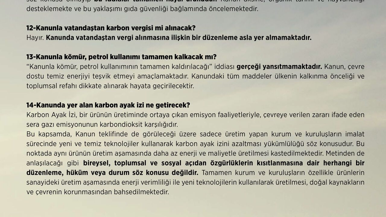 Karbon ayak izi, bir ürünün üretiminde ortaya çıkan emisyon faaliyetleriyle, çevreye verilen zararı ifade eden sera gazı emisyonunun karbondioksit karşılığı anlamına geliyor. Bu kapsamda, kanun teklifinde de görüleceği üzere sadece üretim yapan kurum ve kuruluşların imalat sürecinde yeni ve temiz teknolojiler kullanarak karbon ayak izini azaltması yükümlülüğü söz konusu. Bu noktada aynı ürünün üretim aşamasında daha az enerji ve maliyetle üretilmesi kastedilmekte. Metinden de anlaşılacağı gibi bireysel, toplumsal ve sosyal açıdan özgürlüklerin kısıtlanmasına dair herhangi bir düzenleme, hüküm veya durum söz konusu değil. Tamamen kurum ve kuruluşların özellikle ürünlerin sanayideki üretim aşamasında enerji verimliliği ile yeni teknolojilerin kullanılarak üretilmesi, doğal kaynakların ve çevrenin korunmasından bahsediliyor. (DHA)