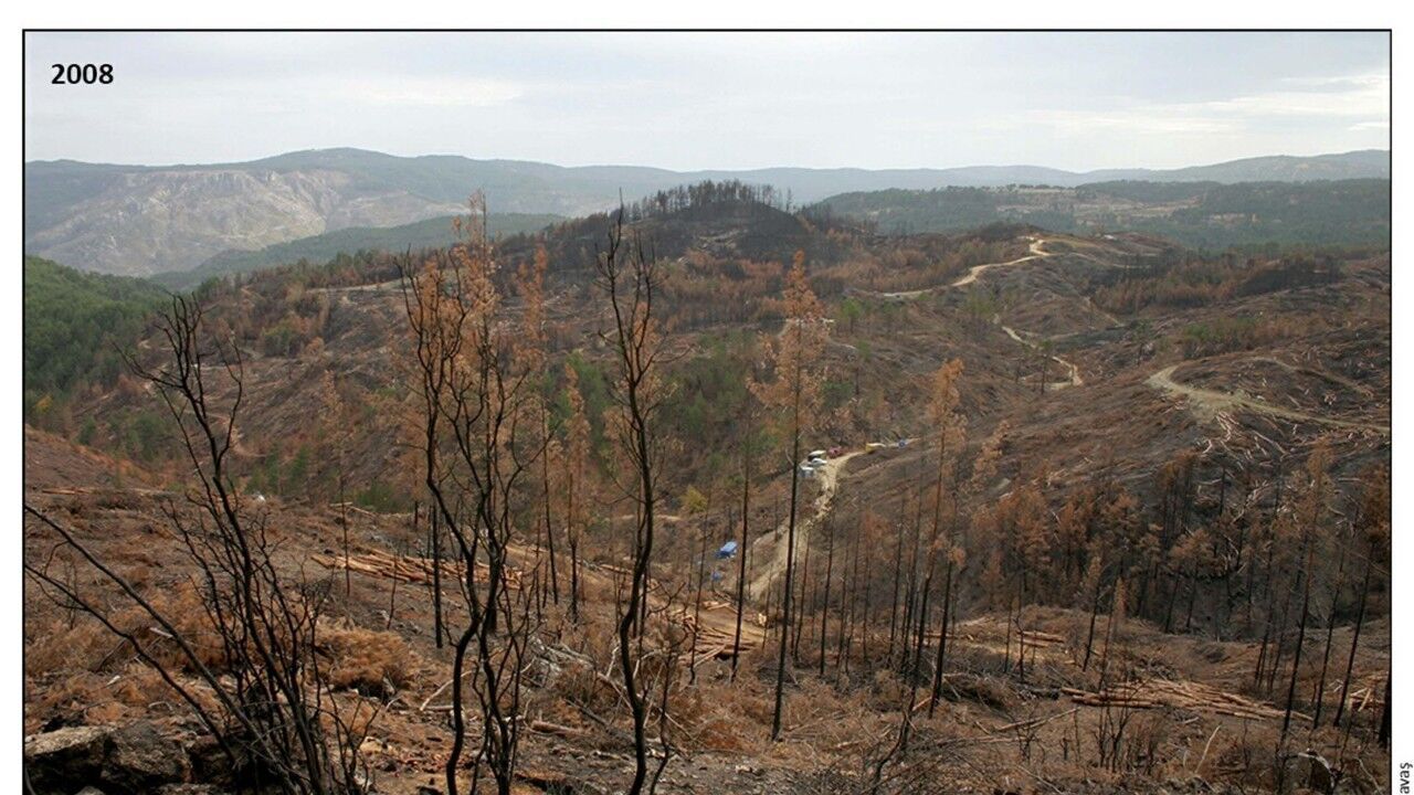 Muğla Orman Bölge Müdürlüğü 2008'deki alanın zarar görmüş hali ile 2024 yılında yeşile döndüğü fotoğrafları sosyal medya hesabından paylaştı. (DHA)