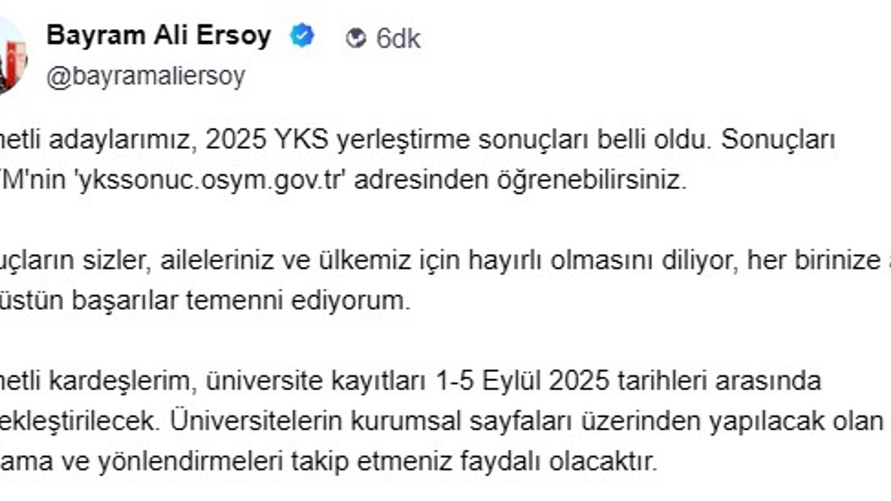 ÖSYM Başkanı Prof. Dr. Bayram Ali Ersoy, konuya ilişkin NSosyal hesabından yaptığı açıklamada, “Kıymetli adaylarımız, 2025 YKS yerleştirme sonuçları belli oldu. Sonuçları ÖSYM'nin 'ykssonuc.osym.gov.tr' adresinden öğrenebilirsiniz. Sonuçların sizler, aileleriniz ve ülkemiz için hayırlı olmasını diliyor, her birinize ayrı ayrı üstün başarılar temenni ediyorum. Kıymetli kardeşlerim, üniversite kayıtları 1-5 Eylül 2025 tarihleri arasında gerçekleştirilecek. Üniversitelerin kurumsal sayfaları üzerinden yapılacak olan açıklama ve yönlendirmeleri takip etmeniz faydalı olacaktır" dedi. (DHA)