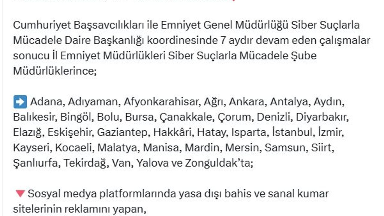 İçişleri Bakanı Ali Yerlikaya, Emniyet Genel Müdürlüğü koordinesinde 'Yasa dışı bahis' suçuna yönelik gerçekleştirilen operasyonu sosyal medya hesabından paylaştı. Buna göre; 7 aydır süren çalışmalar sonucu sosyal medyada yasa dışı bahis ve sanal kumar sitelerinin reklamını yapan, yasa dışı bahis ve sanal kumar oynamaya teşvik eden, aralarında 1 milyondan fazla takipçili 'anonim' ve 'fenomen' hesap olarak tabir edilen hesapların kullanıcılarının da bulunduğu şüphelilere yönelik dün 36 il merkezli operasyon düzenlendi. Operasyon sonucu 104 şüpheli yakalanırken, çok sayıda dijital materyal ele geçirildi. (DHA)