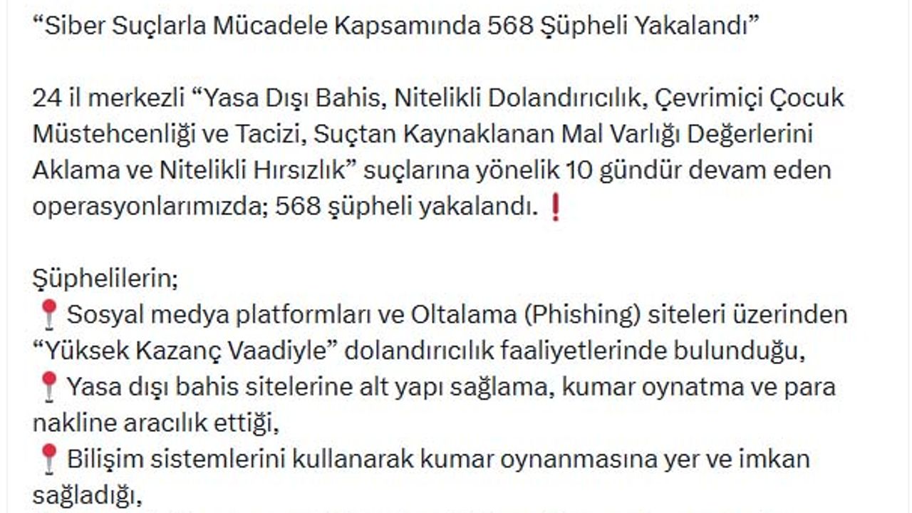 İçişleri Bakanı Ali Yerlikaya'nın sosyal medya hesabından yaptığı açıklamaya göre; Cumhuriyet başsavcılıkları ile Emniyet Genel Müdürlüğü koordinesinde 39 ilde siber suçlara yönelik son 10 günde operasyonlar düzenlendi. Operasyonlarda 568 şüpheli yakalanırken, ruhsatsız tüfekler ile çok sayıda dijital materyal ele geçirildi. Ayrıca, 21 otomobil, 8 motosiklet, 28 arsa/tarla, 9 mesken/dükkan, 11 bahçe olmak üzere toplam, 1 milyar 111 milyon 599 TL'lik para ve mal varlığına el konuldu.