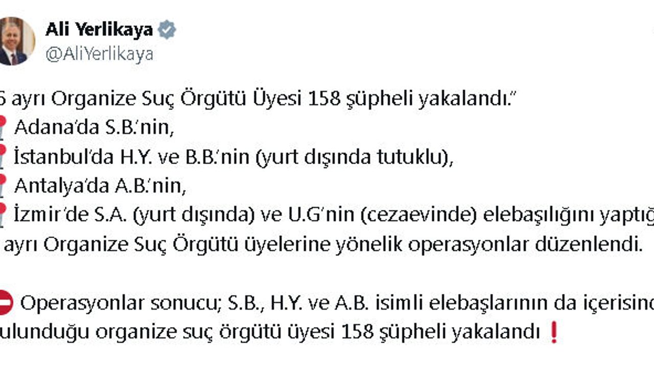 ANKARA, (DHA)- İÇİŞLERİ Bakanı Ali Yerlikaya, Adana, Antalya, İzmir ve İstanbul merkezli operasyonlarda, 6 organize suç örgütü üyesi 158 şüphelinin yakalandığını açıkladı.