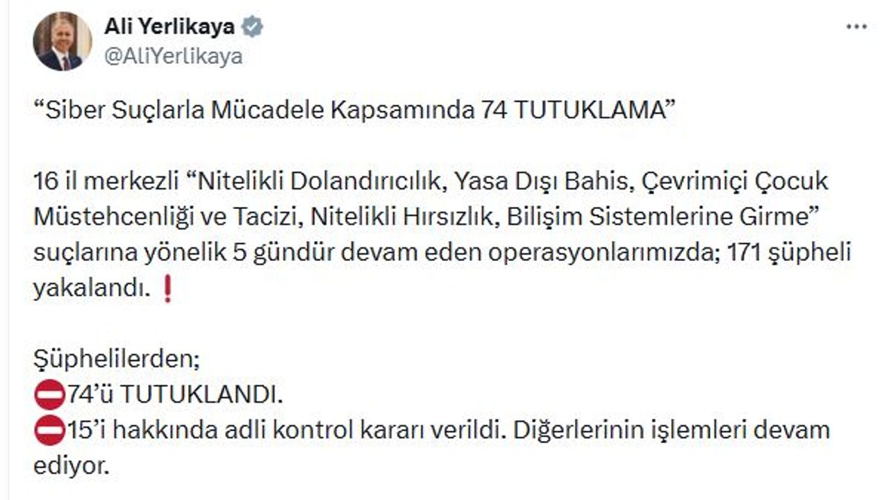 İçişleri Bakanı Ali Yerlikaya, Cumhuriyet başsavcılıkları ile Emniyet Genel Müdürlüğü koordinesinde son 5 gündür yürütülen siber suç operasyonlarını sosyal medya hesabından paylaştı. Buna göre; İl Emniyet Müdürlükleri Siber Suçlarla Mücadele Şube Müdürlüklerince 16 il merkezli 46 ilde 'Nitelikli dolandırıcılık', 'Yasa dışı bahis', 'Çevrim içi çocuk müstehcenliği ve tacizi', 'Nitelikli hırsızlık', 'Bilişim sistemlerine girme' suçlarına yönelik gerçekleştirilen operasyonlarda 171 şüpheli yakalandı. Yapılan aramalarda, ruhsatsız tabancalar ile çok sayıda dijital materyal ele geçirildi. Şüphelilerden 74'ü çıkarıldıkları hakimliklerce tutuklandı, 15'i hakkında adli kontrol kararı verildi. Diğerlerinin işlemleri devam ediyor.