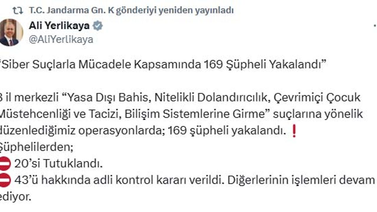 ANKARA, (DHA)- İÇİŞLERİ Bakanı Ali Yerlikaya, 8 il merkezli toplam 68 ilde siber suçlarla mücadele kapsamında düzenlenen operasyonlarda 169 şüphelinin yakalandığını, 20'sinin tutuklandığını açıkladı.
