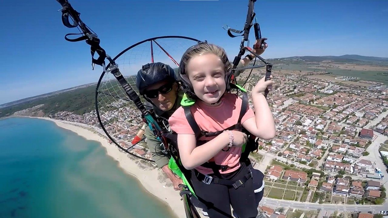 Ünsal YÜCEL/EDİRNE, (DHA)- EDİRNE’nin Saros Körfezi’ne kıyısı bulunan Keşan ilçesine bağlı Erikli köyü sahilinde paramotor pilotu eşliğinde uçuş gerçekleştiren ilkokul 2’nci sınıf öğrencisi Zeynep Beren (7), gökyüzünde İstiklal Marşı’nın ilk 2 kıtasını ezbere okudu.