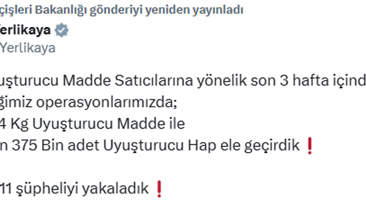 ANKARA, (DHA)- İÇİŞLERİ Bakanı Ali Yerlikaya, 75 ilde son 3 haftada, 1 ton 24 kilogram uyuşturucu ile 5 milyon 375 bin uyuşturucu hap ele geçirildiğini, 2 bin 311 şüphelinin yakalandığını açıkladı.