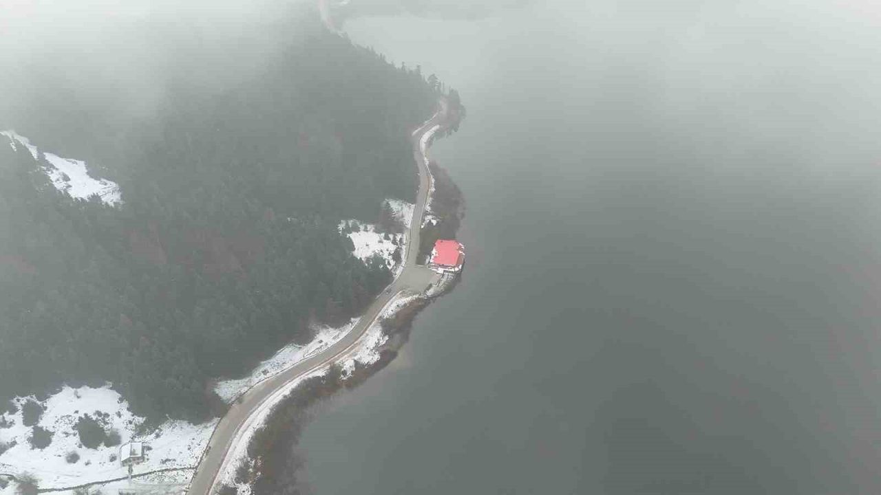 Bolu'nun doğa harikası Abant Gölü Milli Parkı, dağların eteklerini kaplayan kar ve göl üzerine çöken sisle birlikte kartpostallık manzaralar oluşturdu.