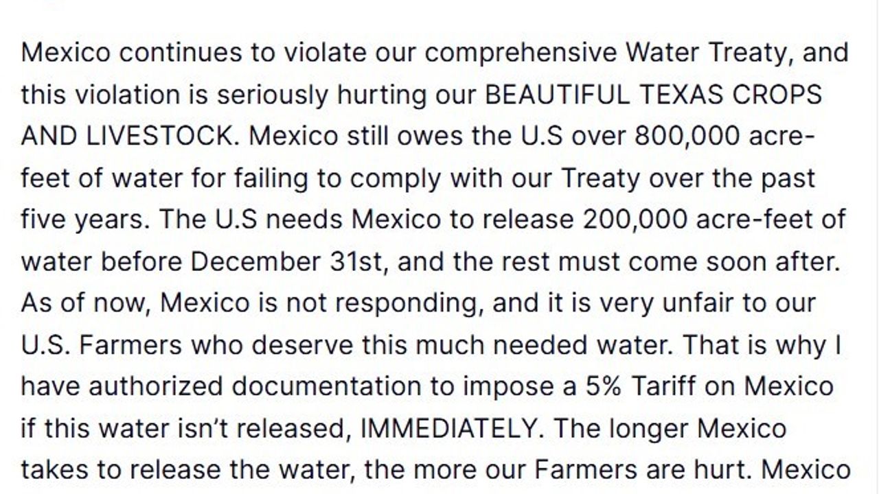 ABD Başkanı Donald Trump, Meksika’nın iki ülke arasındaki su anlaşmasını ihlal ettiğini ve ülkesinin ihtiyaç duyduğu miktarda suyu serbest bırakmadığını belirterek, "Söz konusu su derhal serbest bırakılmadığı takdirde Meksika’ya yüzde 5 gümrük vergisi uygulanmasını öngören belgeleri onayladım" açıklamasında bulundu.