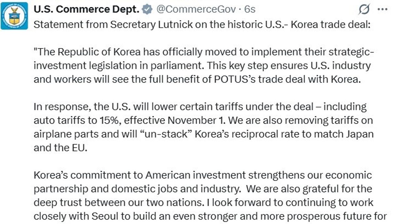 Bu adım karşısında ABD’nin de harekete geçtiğini ifade eden Lutnick, Washington’un da Güney Kore’den ithal edilen otomobillere uygulanan yüzde 25’lik gümrük vergisinde indirime gideceğini belirtti. ABD Ticaret Bakanı Howard Lutnick, "Buna karşılık ABD 1 Kasım’dan itibaren otomobil gümrük vergilerinin yüzde 15’e indirilmesi de dahil belirli gümrük vergilerini düşürecek. Ayrıca uçak parçalarındaki gümrük vergilerini kaldırıyoruz ve Güney Kore’nin karşılıklı tarife oranı Japonya ve AB ile aynı seviyeye getirilecek" dedi.