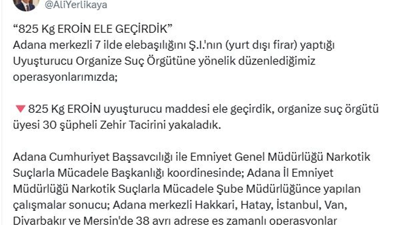 ANKARA, (DHA)- İÇİŞLERİ Bakanı Ali Yerlikaya, Adana merkezli 7 ilde düzenlenen uyuşturucu operasyonunda 825 kilogram eroinin ele geçirildiğini, 30 şüphelinin gözaltına alındığını açıkladı.