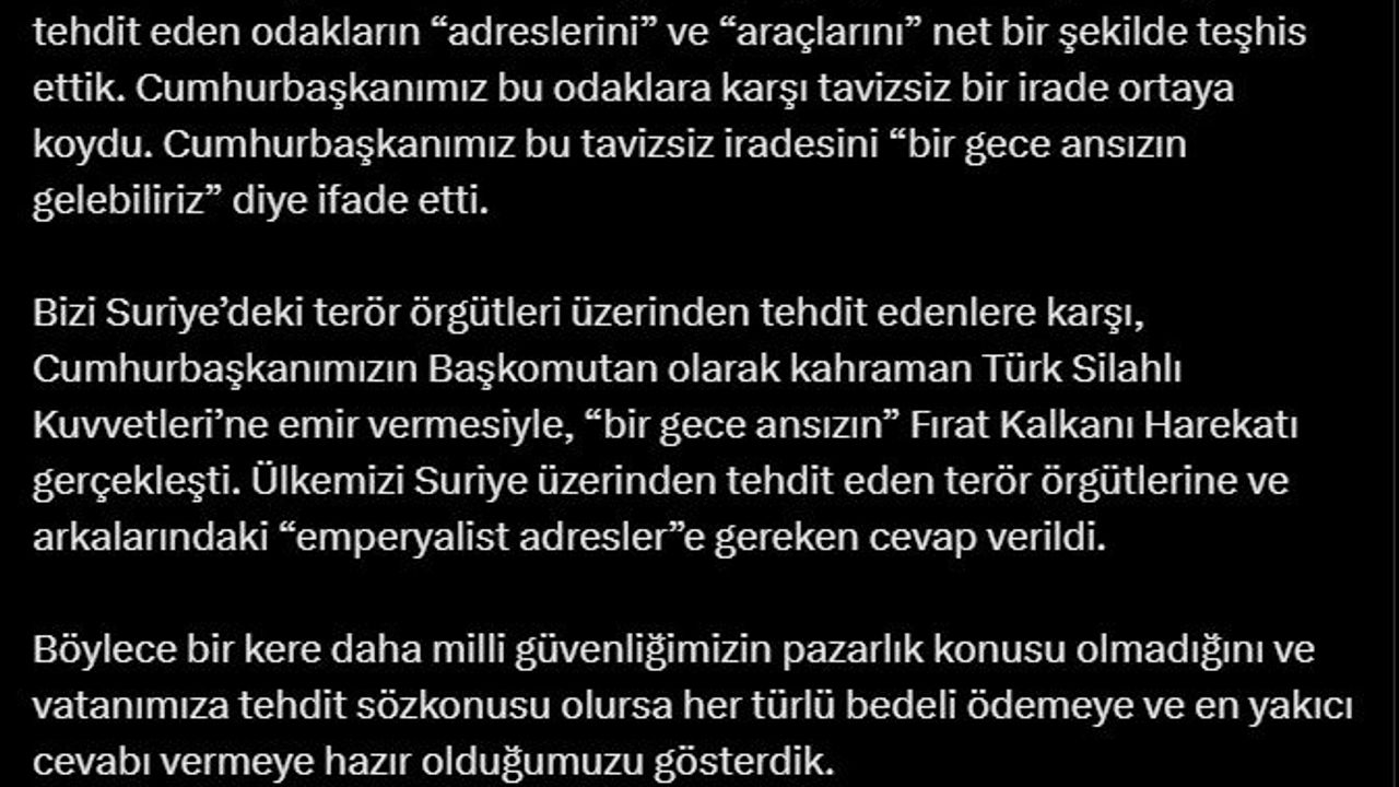AK Parti Sözcüsü Çelik, sosyal medya hesabından yaptığı paylaşımda, "Yakın bölgemize dönük emperyalist planların başında sınırı bölgelerimize yakın yerlerde 'terör devletçikleri' kurmak vardı. Terör örgütlerini kullanarak bölgemizi istikrarsızlaştırmaya çalışan ve milli güvenliğimizi tehdit eden odakların 'adreslerini' ve 'araçlarını' net bir şekilde teşhis ettik. Cumhurbaşkanımız bu odaklara karşı tavizsiz bir irade ortaya koydu. Cumhurbaşkanımız bu tavizsiz iradesini 'Bir gece ansızın gelebiliriz' diye ifade etti. Bizi Suriye’deki terör örgütleri üzerinden tehdit edenlere karşı, Cumhurbaşkanımızın Başkomutan olarak kahraman Türk Silahlı Kuvvetleri’ne emir vermesiyle, 'bir gece ansızın' Fırat Kalkanı Harekatı gerçekleşti. Ülkemizi Suriye üzerinden tehdit eden terör örgütlerine ve arkalarındaki 'emperyalist adresler'e gereken cevap verildi. Böylece bir kere daha milli güvenliğimizin pazarlık konusu olmadığını ve vatanımıza tehdit söz konusu olursa her türlü bedeli ödemeye ve en yakıcı cevabı vermeye hazır olduğumuzu gösterdik. Fırat Kalkanı Harekatı’nın 9’uncu yıl dönümünde, tarihi şan ve şereflerle dolu Türk Silahlı Kuvvetlerimizi selamlıyoruz. Aziz şehitlerimize Allah’tan rahmet, gazilerimize sağlıklı hayat diliyoruz" dedi. (DHA)