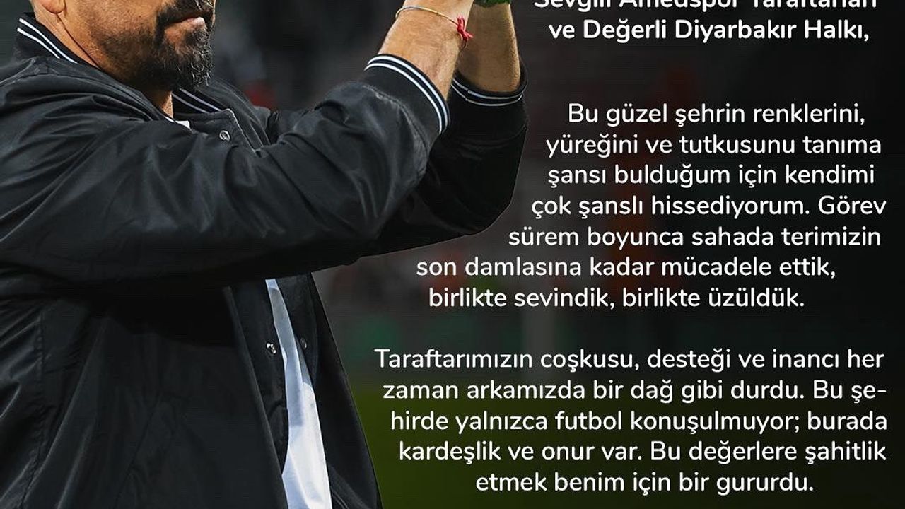 Sosyal medya hesabından paylaşım yapan Çetin, “Sevgili Amedspor taraftarları ve değerli Diyarbakır halkı. Bu güzel şehrin renklerini, yüreğini ve tutkusunu tanıma şansı bulduğum için kendimi çok şanslı hissediyorum. Görev sürem boyunca sahada terimizin son damlasına kadar mücadele ettik, birlikte sevindik, birlikte üzüldük. Taraftarlarımızın coşkusu, desteği ve inancı her zaman arkamızda bir dağ gibi durdu. Bu şehirde yalnızca futbol konuşulmuyor; burada kardeşlik ve onur var. Bu değerlere şahitlik etmek benim için gururdu. Ayrılık vakti geldiğinde söylenecek en doğru söz, teşekkür etmektir. Kulüp yönetimine, Amedspor ailesine, kulüp emekçilerine ve en çok da yüreğiyle takımını destekleyen o güzel insanlara sonsuz teşekkürler” dedi.(DHA)