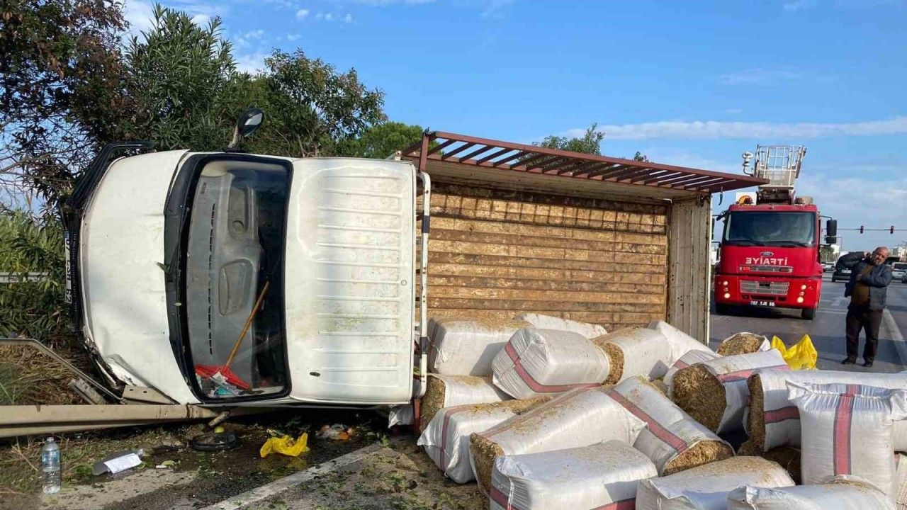 Antalya’nın Serik ilçesinde saman yüklü kamyonetin devrilmesi sonucu samanlar yola savruldu.