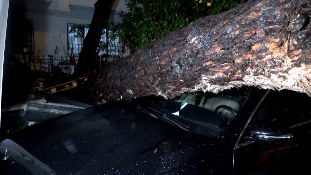Sarı alarm verilen Antalya’da etkili olan yağış ve şiddetli rüzgar daha önce şikayet edildiği iddia edilen ağacın devrilmesine yol açtı. Olayda iki araç ve bir binada hasar oluşurken şans eseri kimse yaralanmadı.