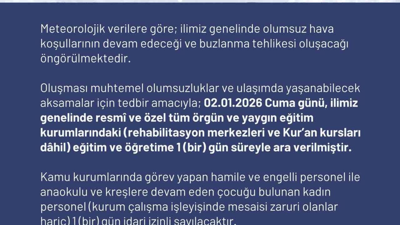 Ardahan Valiliği'nden yapılan açıklamada, 'Meteorolojik verilere göre; ilimiz genelinde olumsuz hava koşullarının devam edeceği ve buzlanma tehlikesi oluşacağı öngörülmektedir. Oluşması muhtemel olumsuzluklar ve ulaşımda yaşanabilecek aksamalar için tedbir amacıyla 2 Ocak 2026 Cuma günü, ilimiz genelinde resmi ve özel tüm örgün ve yaygın eğitim kurumlarındaki (rehabilitasyon merkezleri ve Kur'an kursları dahil) eğitim ve öğretime 1 gün süreyle ara verilmiştir.