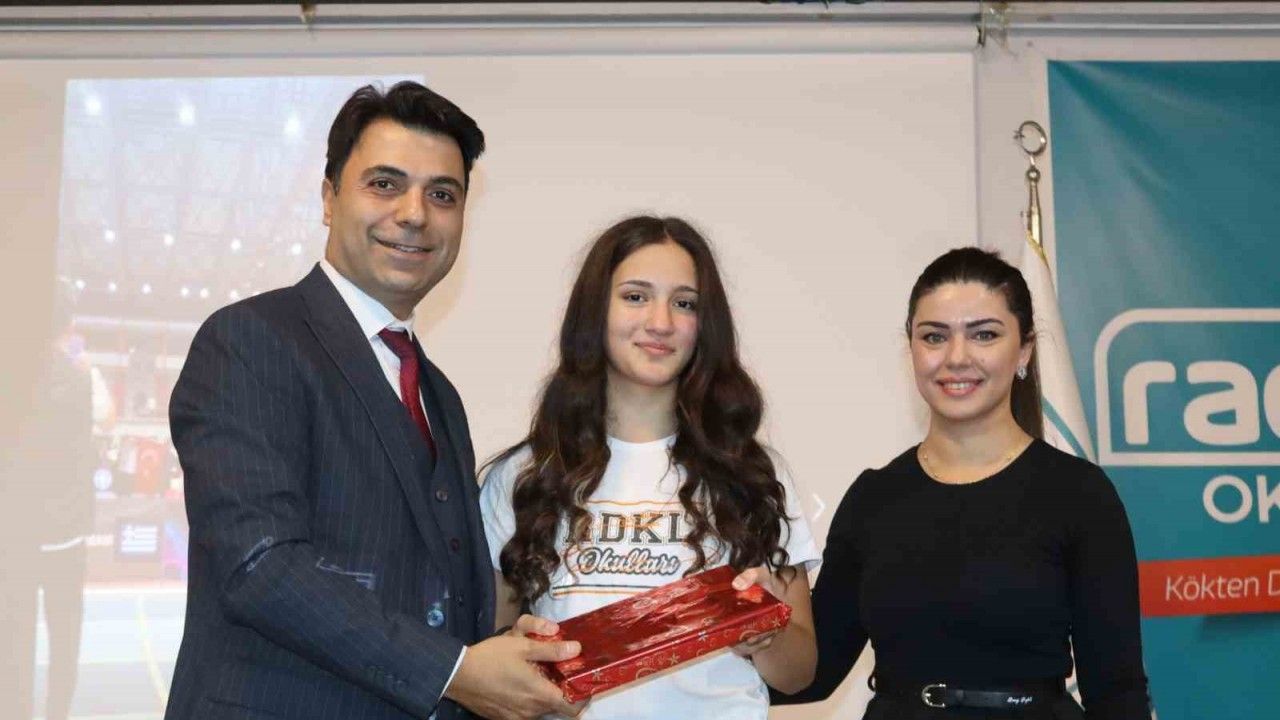 Yunanistan’da düzenlenen Avrupa Yıldızlar Taekwondo Şampiyonası’nda mücadele eden Radikal Konak Anadolu Lisesi öğrencisi Elif Esmira Özdirim, kızlar 59 kiloda tüm rakiplerini geride bırakarak Avrupa şampiyonu oldu. Genç sporcu, zorlu turnuvada çıktığı dört maçın tamamını kazanarak altın madalyaya uzandı. Genç şampiyona, öğrenim gördüğü Radikal Konak Anadolu Lisesi’nde ödül töreni düzenlendi. Törene, Radikal Eğitim Kurumları Genel Müdür Yardımcısı Ferhat Arslan, Radikal Konak Anadolu Lisesi Müdürü Mutlu Kara, Müdür Yardımcısı Müge Çakır, Radikal Eğitim Kurumları Kurumsal İletişim Müdürü Şive Karataş ve Rehberlik ve ARGE Koordinatörü Şule Baş katılırken öğrenci arkadaşları Elif Esmira Özdirim’i alkışlarla tebrik etti. Hem okuluna hem de ülkeye gurur yaşatan Elif Esmira Özdirim’e, Radikal Eğitim Kurumları Genel Müdür Yardımcısı Ferhat Arslan, Radikal Konak Anadolu Lisesi Müdürü Mutlu Kara plaket ve çiçek takdim etti.