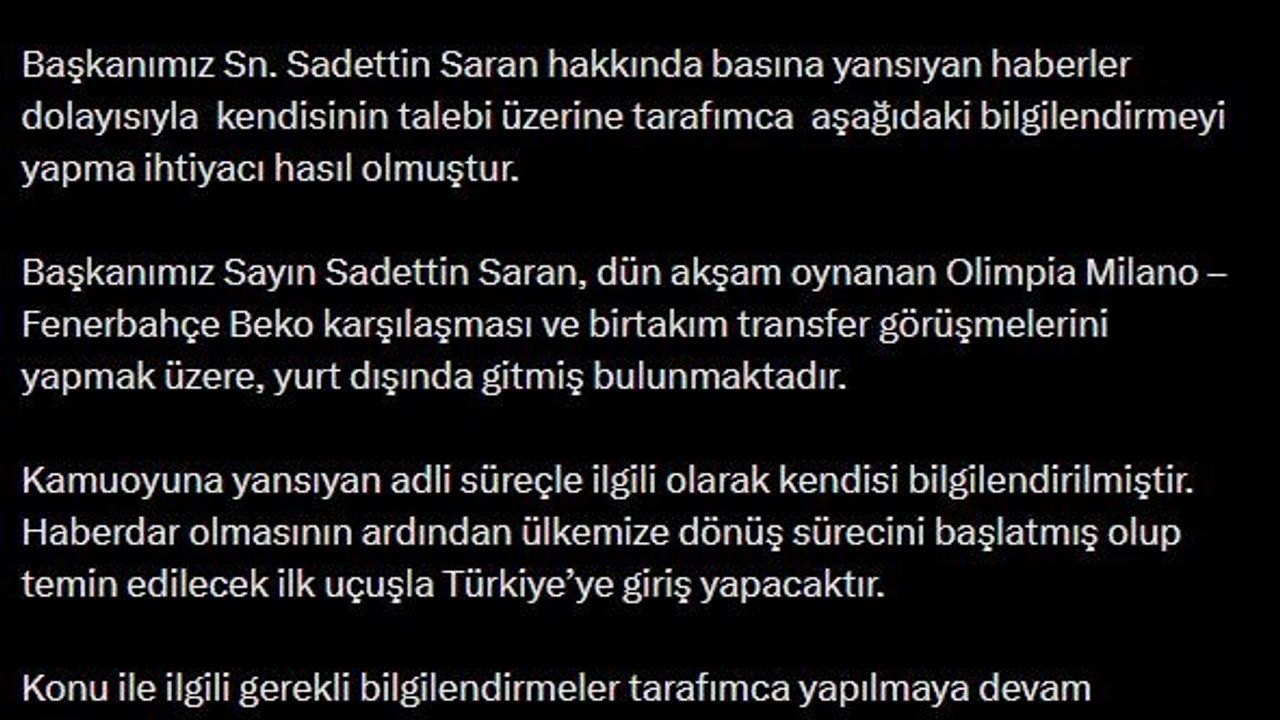 Avukat Ali Alper Alpoğlu, İstanbul Cumhuriyet Başsavcılığı tarafından yürütülen uyuşturucu soruşturması kapsamında ifadeye çağırılan Fenerbahçe Spor Kulübü Başkanı Sadettin Saran ile ilgili yazılı açıklama yaptı. Saran'ın ilk uçakla Türkiye'ye giriş yapacağını belirten Alpoğlu, 'Başkanımız Sadettin Saran hakkında basına yansıyan haberler dolayısıyla kendisinin talebi üzerine tarafımca aşağıdaki bilgilendirmeyi yapma ihtiyacı hasıl olmuştur. Başkanımız Sayın Sadettin Saran, dün akşam oynanan Olimpia Milano-Fenerbahçe Beko karşılaşması ve birtakım transfer görüşmelerini yapmak üzere, yurt dışında gitmiş bulunmaktadır. Kamuoyuna yansıyan adli süreçle ilgili olarak kendisi bilgilendirilmiştir. Haberdar olmasının ardından ülkemize dönüş sürecini başlatmış olup temin edilecek ilk uçuşla Türkiye'ye giriş yapacaktır. Konu ile ilgili gerekli bilgilendirmeler tarafımca yapılmaya devam edilecektir' ifadelerine yer verdi.