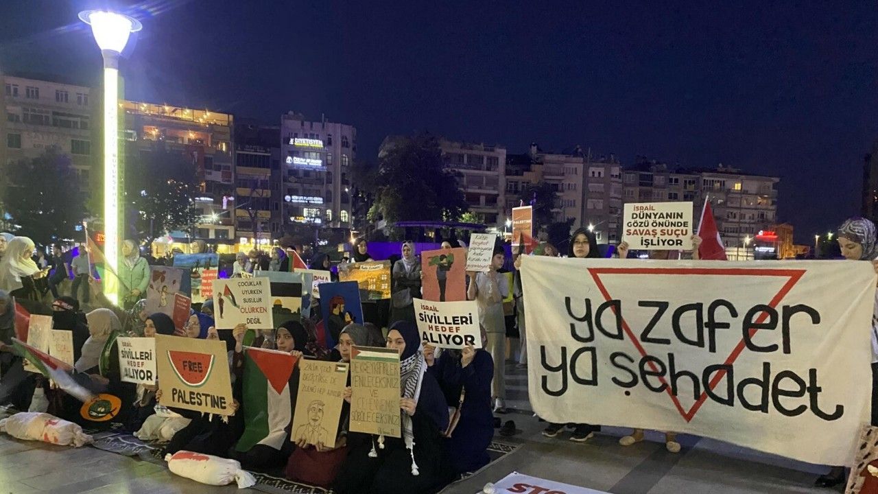 İsrail’in Filistin’e yönelik saldırıları, Efeler ilçesinde saat 21.00'de başlayan programla protesto edildi. Aydın Sivil Dayanışma Platformu öncülüğünde yapılan protestoda oturma eylemi düzenlendi. Atatürk Kent Meydanı’nda bir araya gelen vatandaşlar, 'İsrail sivilleri hedef alıyor', 'çocuklar uyurken susulur ölürken değil' ve 'free Palestine' dövizleri açıldı. Programda daha sonra Kuran’ı Kerim Tilaveti ve dua okundu. Eyleme katılanlar, 'Katil İsrail Filistin'den defol', 'Çocuklar ölürken susmayacağız', 'Katil İsrail ve Amerika' gibi sloganlar attı.