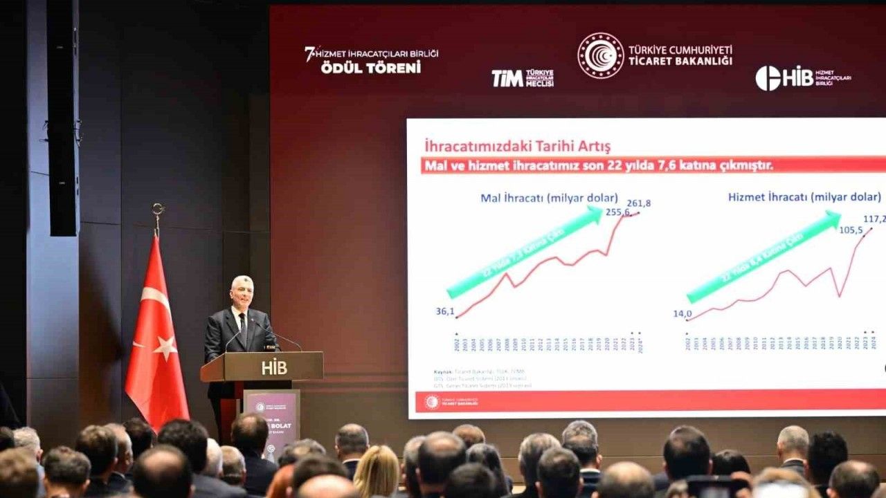 2025 yılı için 390 milyar dolarlık mal ve hizmet ihracatı hedefinin olduğunu da hatırlatan Bakan Bolat, ‘‘390 milyar dolarlık mal ve hizmet ihracatını aşmayı hedefliyoruz. Hizmetler sektöründe istihdam sayısı 21 milyona ulaştı. Bu yıl hizmet ihracatı 121 milyar doları aşacak. Türkiye’ye yaklaşık 62 milyar dolar net dış ticaret fazlası elde edecek’’ diye konuştu.