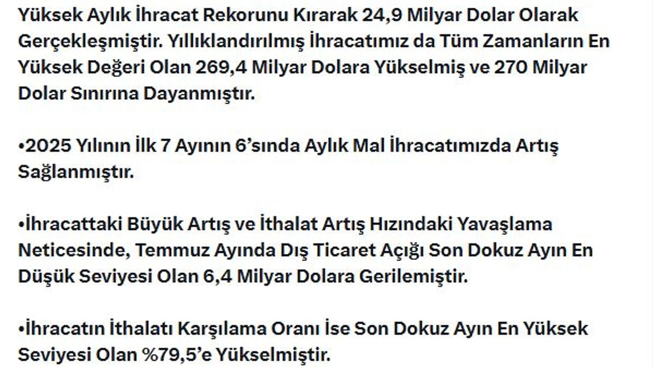 Ticaret Bakanı Ömer Bolat, temmuz ayı dış ticaret verilerine ilişkin sosyal medya hesabından açıklama yaptı. Bakan Bolat, "2025 yılı Temmuz ayında ihracatımız Cumhuriyet tarihimizin en yüksek aylık ihracat rekorunu kırarak 24,9 milyar dolar olarak gerçekleşmiştir. Yıllıklandırılmış ihracatımız da tüm zamanların en yüksek değeri olan 269,4 milyar dolara yükselmiş ve 270 milyar dolar sınırına dayanmıştır. 2025 yılının ilk 7 ayının 6'sında aylık mal ihracatımızda artış sağlanmıştır. İhracattaki büyük artış ve ithalat artış hızındaki yavaşlama neticesinde, temmuz ayında dış ticaret açığı son 9 ayın en düşük seviyesi olan 6,4 milyar dolara gerilemiştir. İhracatın ithalatı karşılama oranı ise son dokuz ayın en yüksek seviyesi olan yüzde 79,5'e yükselmiştir. Artan mal ve hizmet ihracatıyla temmuz ayında cari işlemler hesabında fazla verilmesi beklenmektedir" dedi.