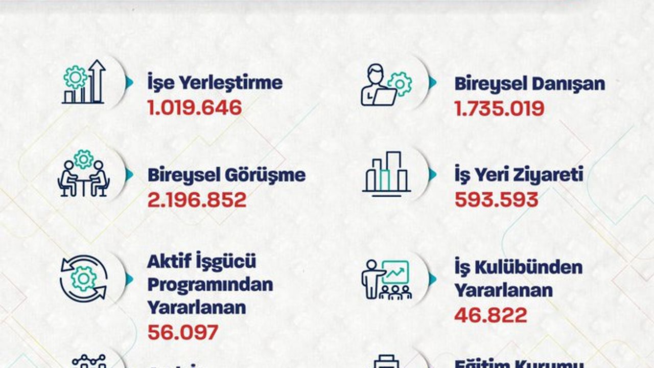 ANKARA, (DHA)- ÇALIŞMA ve Sosyal Güvenlik Bakanı Vedat Işıkhan, Türkiye İş Kurumu'nun (İŞKUR) Ocak-Ağustos ayları arasında 1 milyon 19 bin 646 işe yerleştirmeye aracılık ettiğini açıkladı.