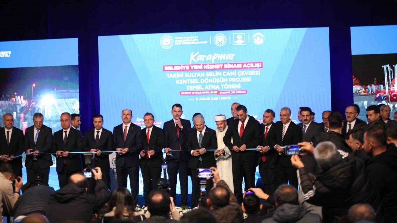 Çeşitli programlara katılmak üzere Konya’ya gelen Çevre, Şehircilik ve İklim Değişikliği Bakanı Murat Kurum, Konya’nın Karapınar ilçesinde Belediye Yeni Hizmet Binası açılışı ve Tarihi Sultan Selim Çevresi Kentsel Dönüşüm Projesi Temel Atma Törenine katıldı. Programda konuşan Bakan Murat Kurum, "Selçuklu’nun emanetini omuzlarında taşıyan Karapınar’ımız ilimle, sporla, güzelliklerle anılsın. Açılışını yapacağımız, temelini atacağımız bu güzel eserlerle hedefimize bir adım daha yaklaşacağız. Hem şehrimizin ihtiyaçlarına cevap verecek hem de hemşehrilerimize daha kaliteli hizmet sunmanın kapılarını açacağız. Açılışını yapacağımız yeni belediye hizmet binamız; teknolojik altyapısıyla, vatandaşlarımızın işlemlerini kolaylaştıran düzenlemeleriyle, personelimizin daha verimli çalışabileceği alanlarıyla ve şık mimarisiyle Karapınar’ımızın geleceğine yakışır bir eser oldu. Bugün ayrıca, çok önemli bir projenin daha başlangıcına hep birlikte şahitlik edeceğiz. Karapınar’ın kimliğini oluşturan Tarihi Sultan Selim Camii Çevresi Projesi’nin de temel atma törenini gerçekleştireceğiz. İnşallah burada da TOKİ’mizle; 51 konut, 249 dükkan, Kur’an Kursu ve kapalı otoparkımızı hızla yapacak ve 2026 yılında sizlere teslim edeceğiz. Camimizin çevresindeki tüm köhneleşmiş yapıları yıkarak, burayı yeni bir meydan olarak tasarlayacağız; böylece hem camimizi ön plana çıkaracak hem de bölgemizi sosyal ve kültürel açıdan daha da canlandıracağız. Karapınar’ın kalbi bu alan hemşehrilerimizin uğrak mekanı olacak" dedi.