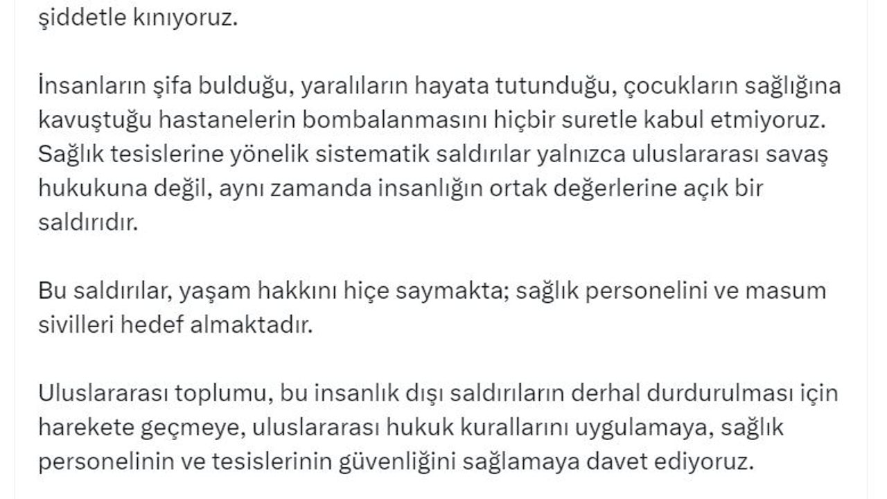 ANKARA, (DHA)- SAĞLIK Bakanı Kemal Memişoğlu, İsrail'in Gazze'de hastaneye düzenlediği saldırıya ilişkin, "Bu saldırılar, yaşam hakkını hiçe saymakta; sağlık personelini ve masum sivilleri hedef almaktadır. Uluslararası toplumu, bu insanlık dışı saldırıların derhal durdurulması için harekete geçmeye, uluslararası hukuk kurallarını uygulamaya, sağlık personelinin ve tesislerinin güvenliğini sağlamaya davet ediyoruz" dedi.