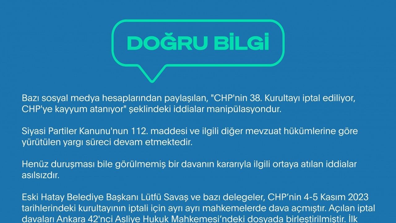 Cumhurbaşkanlığı İletişim Başkanlığı Dezenformasyonla Mücadele Merkezi'nin (DMM), sosyal medya hesabından yapılan açıklamada, "Bazı sosyal medya hesaplarından paylaşılan, 'CHP'nin 38. Kurultayı iptal ediliyor, CHP'ye kayyum atanıyor' şeklindeki iddialar manipülasyondur. Siyasi Partiler Kanunu'nun 112. maddesi ve ilgili diğer mevzuat hükümlerine göre yürütülen yargı süreci devam etmektedir. Henüz duruşması bile görülmemiş bir davanın kararıyla ilgili ortaya atılan iddialar asılsızdır. Eski Hatay Belediye Başkanı Lütfü Savaş ve bazı delegeler, CHP’nin 4-5 Kasım 2023 tarihlerindeki kurultayının iptali için ayrı ayrı mahkemelerde dava açmıştır. Açılan iptal davaları Ankara 42'nci Asliye Hukuk Mahkemesi’ndeki dosyada birleştirilmiştir. İlk duruşma yarın yapılacaktır. Türk milleti adına bağımsız mahkemelerce verilen kararlar, ilk olarak duruşmalarda direkt olarak muhataplara açıklanmaktadır. Yargı süreçleriyle ilgili algı oluşturmak maksadıyla ortaya atılan asılsız iddialara itibar etmeyiniz" denildi.