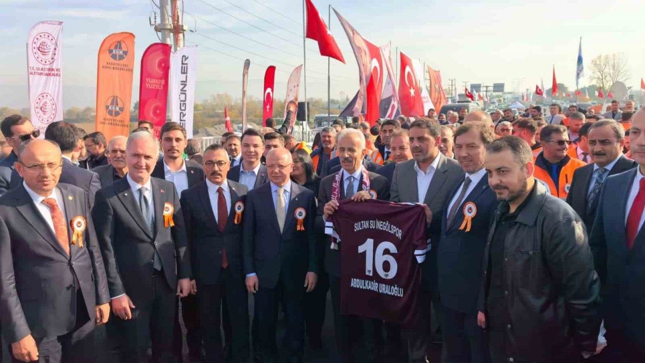 Bakan Uraloğlu, "Siz üretmeye devam edin, biz yolunuzu açmaya devam edeceğiz diyoruz ve bunu da hayata geçiriyoruz. İnegöl giriş kavşağı işte bu sözün tam da nişanesidir. Konuşma metninde yoktu öğleden sonraki programa ayırdım ama burada da İnegöllü kardeşlerimle paylaşayım. Biz İnşallah önümüzdeki yıl Bursa’mıza yüksek hızlı trenle seyahat edeceğiz. 2026 yılında biz Bursa’ya yaptığımız gezilerden bir tanesini inşallah Ankara’dan İstanbul’dan hızlı trenle yapmış olacağız, projeyi yakından takip ediyoruz. Nazar etme ne olur, çalış senin de olur diyoruz ya onun için de bazen muhalif kardeşlerimizde onların haklı eleştirilerinin başımızın üzerinde yeri vardır. Ama bu anlamda onların da eleştirdiği bu konuları biz İnşallah hayata geçirmiş olacağız" diye konuştu.
