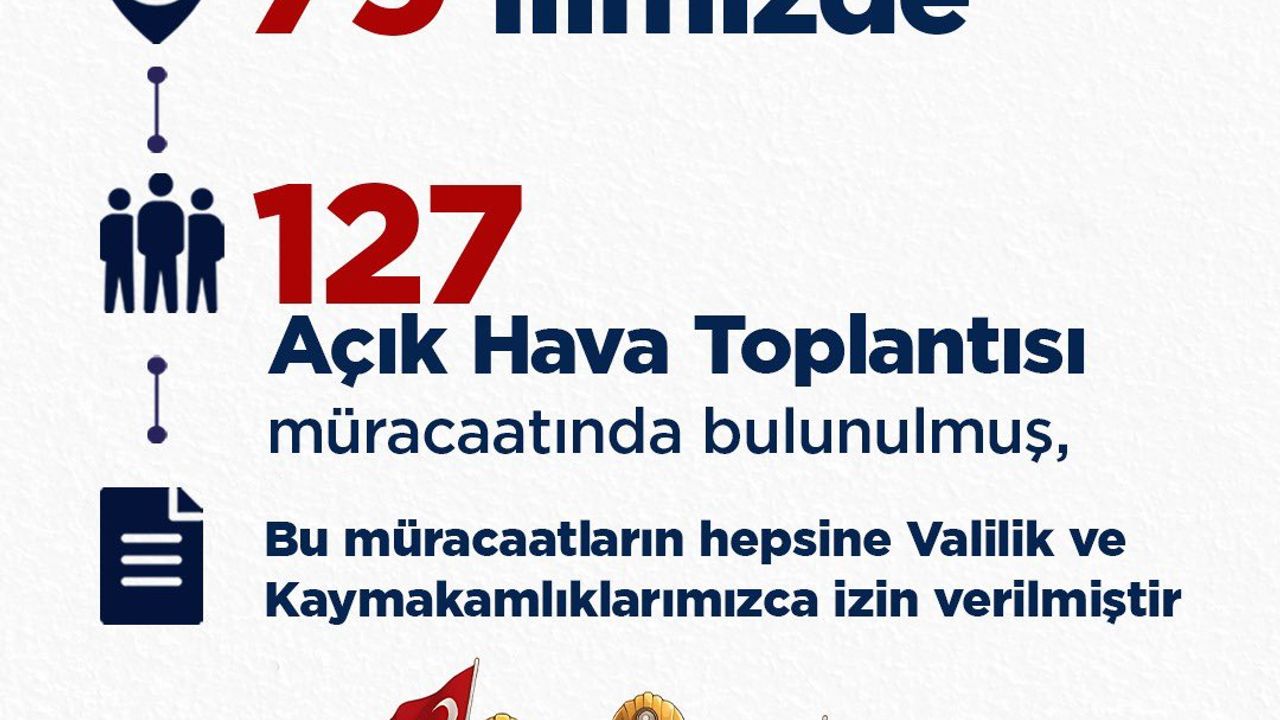 ANKARA, (DHA)- İÇİŞLERİ Bakanı Ali Yerlikaya, 1 Mayıs Emek ve Dayanışma Günü'nü kutlayarak, "2911 Sayılı Toplantı ve Gösteri Yürüyüşleri Kanunu kapsamında 79 ilimizde 127 açık hava toplantısı müracaatında bulunulmuş; bu müracaatların hepsine mülki idare amirliklerimizce izin verilmiştir" dedi.