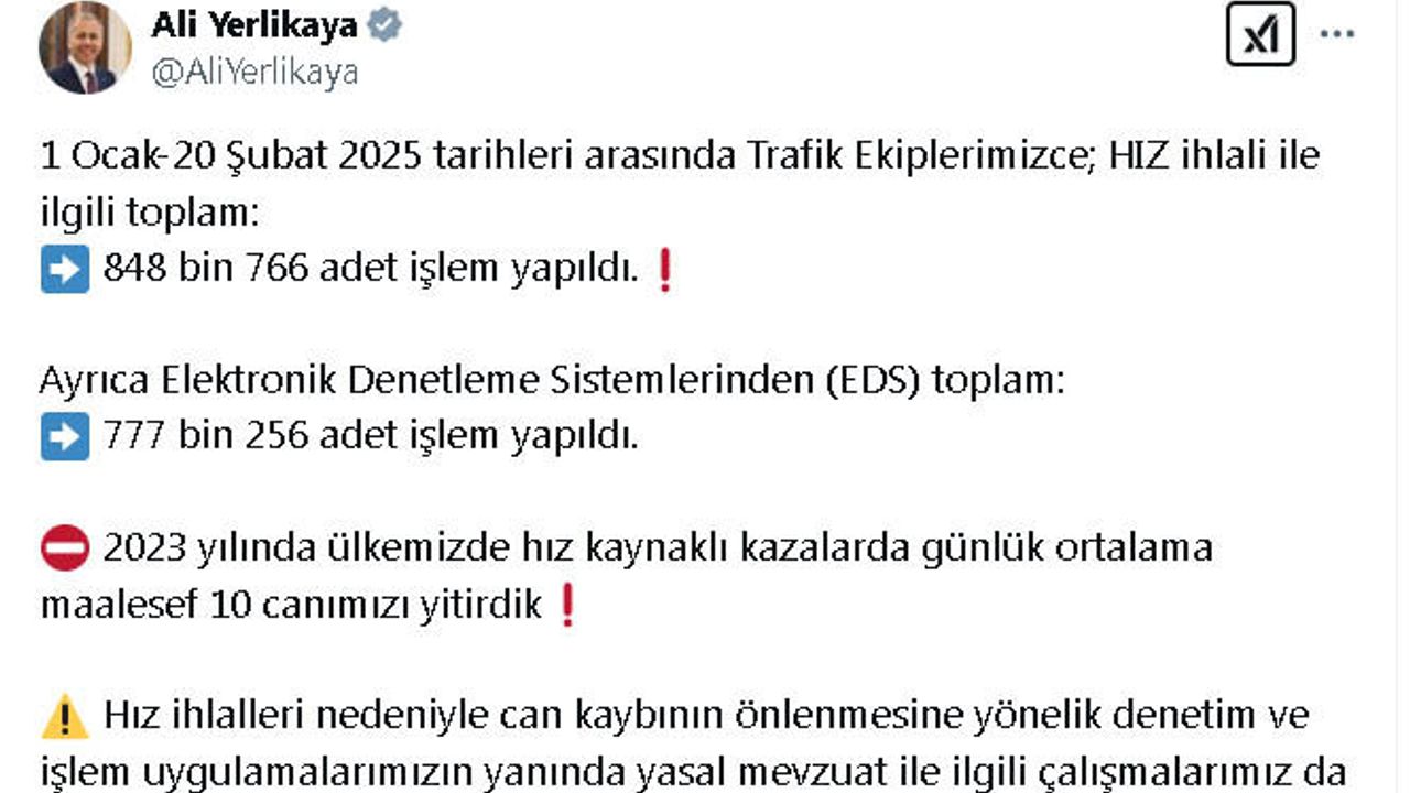 İçişleri Bakanı Ali Yerlikaya, trafik denetimleri ile ilgili sosyal medya hesabından açıklama yaptı. Bakan Yerlikaya, "1 Ocak-20 Şubat 2025 tarihleri arasında trafik ekiplerimizce hız ihlali ile ilgili toplam 848 bin 766 adet işlem yapıldı. Ayrıca Elektronik Denetleme Sistemlerinden (EDS) toplam 777 bin 256 adet işlem yapıldı. 2023 yılında ülkemizde hız kaynaklı kazalarda günlük ortalama maalesef 10 canımızı yitirdik. Hız ihlalleri nedeniyle can kaybının önlenmesine yönelik denetim ve işlem uygulamalarımızın yanında yasal mevzuat ile ilgili çalışmalarımız da tamamlanmak üzere. Araç kullanırken hız sınırlarını aşmak, sadece birkaç dakika erken varmak için hem kendi hayatınızı hem de başkalarının hayatını tehlikeye atmak demektir. Unutmayalım, hız kazandırmaz, hayatımızdan çalar. Önceliğimiz hız değil, güvenlik olsun" dedi.
