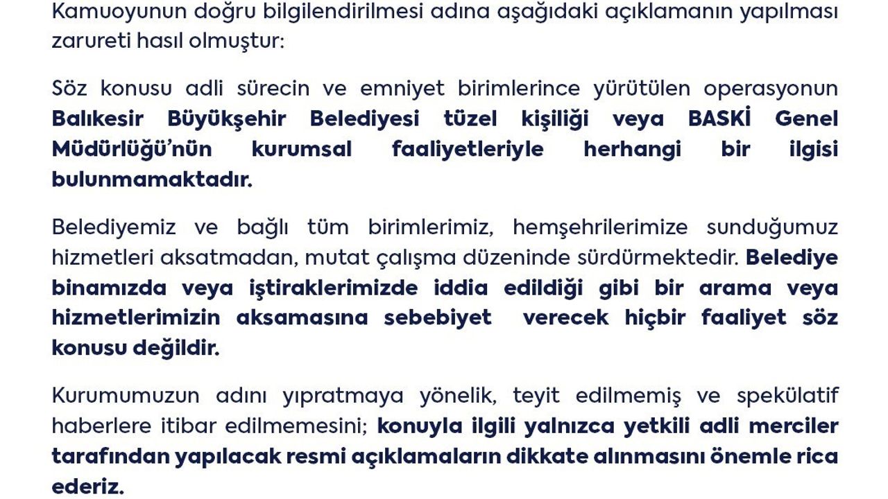 Operasyon ardından Balıkesir Büyükşehir Belediyesi'nden yazılı açıklama yapıldı. Açıklamada, 'Bazı basın yayın organlarında ve sosyal medya mecralarında, Balıkesir Büyükşehir Belediyemiz ve iştirakimiz olan BASKİ Genel Müdürlüğü'ne yönelik bir operasyon gerçekleştirildiğine ve personelimizin gözaltına alındığına dair iddialar yer almaktadır. Söz konusu adli sürecin ve emniyet birimlerince yürütülen operasyonun Balıkesir Büyükşehir Belediyesi tüzel kişiliği veya BASKİ Genel Müdürlüğü'nün kurumsal faaliyetleriyle herhangi bir ilgisi bulunmamaktadır. Belediyemiz ve bağlı tüm birimlerimiz, hemşehrilerimize sunduğumuz hizmetleri aksatmadan, mutat çalışma düzeninde sürdürmektedir. Belediye binamızda veya iştiraklerimizde iddia edildiği gibi bir arama veya hizmetlerimizin aksamasına sebebiyet verecek hiçbir faaliyet söz konusu değildir. Kurumumuzun adını yıpratmaya yönelik, teyit edilmemiş ve spekülatif haberlere itibar edilmemesini; konuyla ilgili yalnızca yetkili adli merciler tarafından yapılacak resmi açıklamaların dikkate alınmasını önemle rica ederiz. Balıkesir Büyükşehir Belediyesi olarak hukukun üstünlüğü ve şeffaf yönetim anlayışımızla görevimizin başında olduğumuzu kamuoyunun bilgisine saygıyla sunarız' denildi.