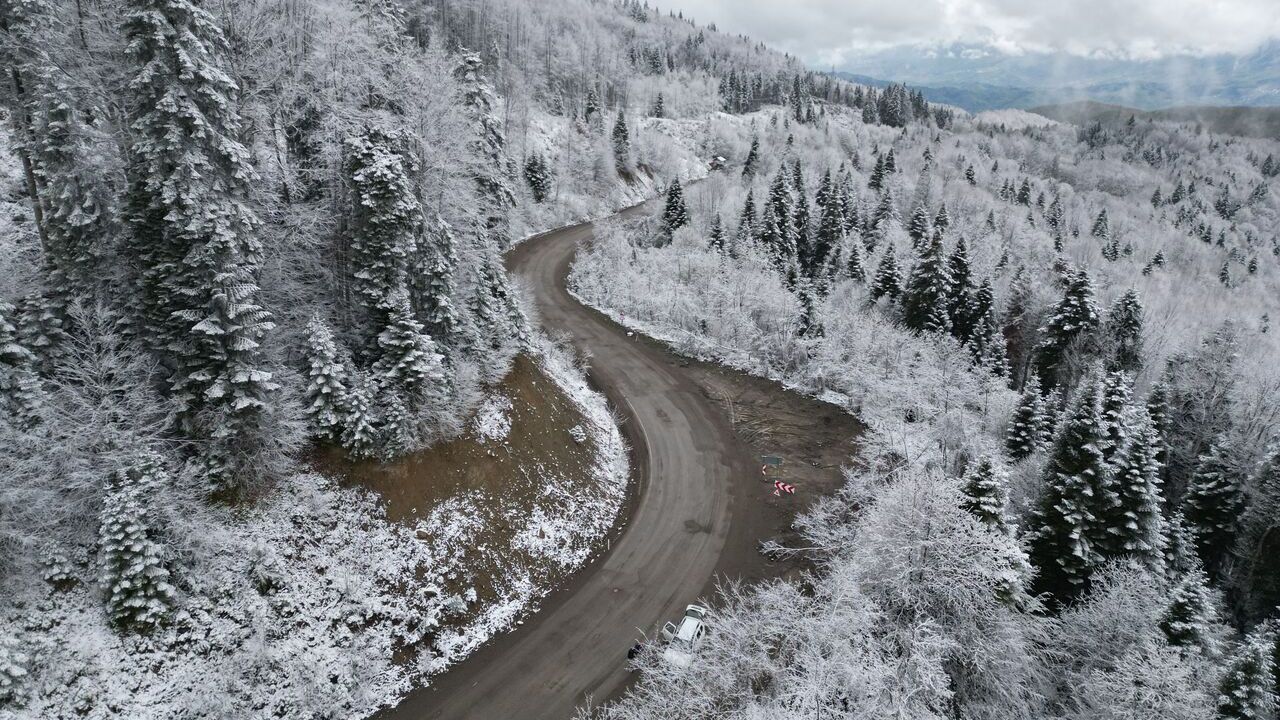 Ayhan ACAR/ULUS (Bartın), (DHA)- BARTIN-Kastamonu kara yolunun Soğucaksu Geçidi'nde nisan ayında kar yağışı etkili oldu. 1030 rakımlı zirvede kar kalınlığı 5 santimetreye ulaşırken, ilkbaharda yemyeşil doğayla beyaz örtü bütünleşti. Oluşan manzara dronla görüntülendi.
