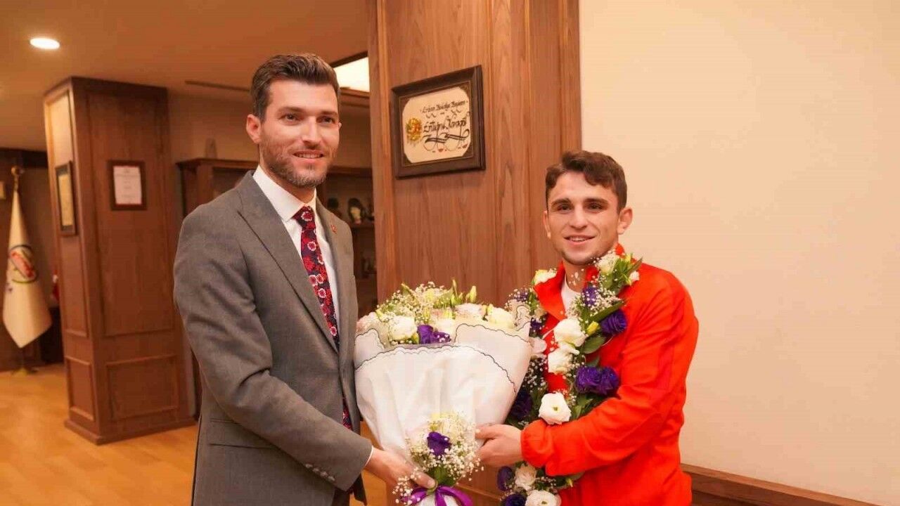 Erbaa Belediye Başkanı Ertuğrul Karagöl Azerbaycan’da düzenlenen Ordulararası Serbest Güreş Şampiyonası’nda Dünya Şampiyonu olan Ahmet Duman’ı tebrik ederek hediye takdim etti.