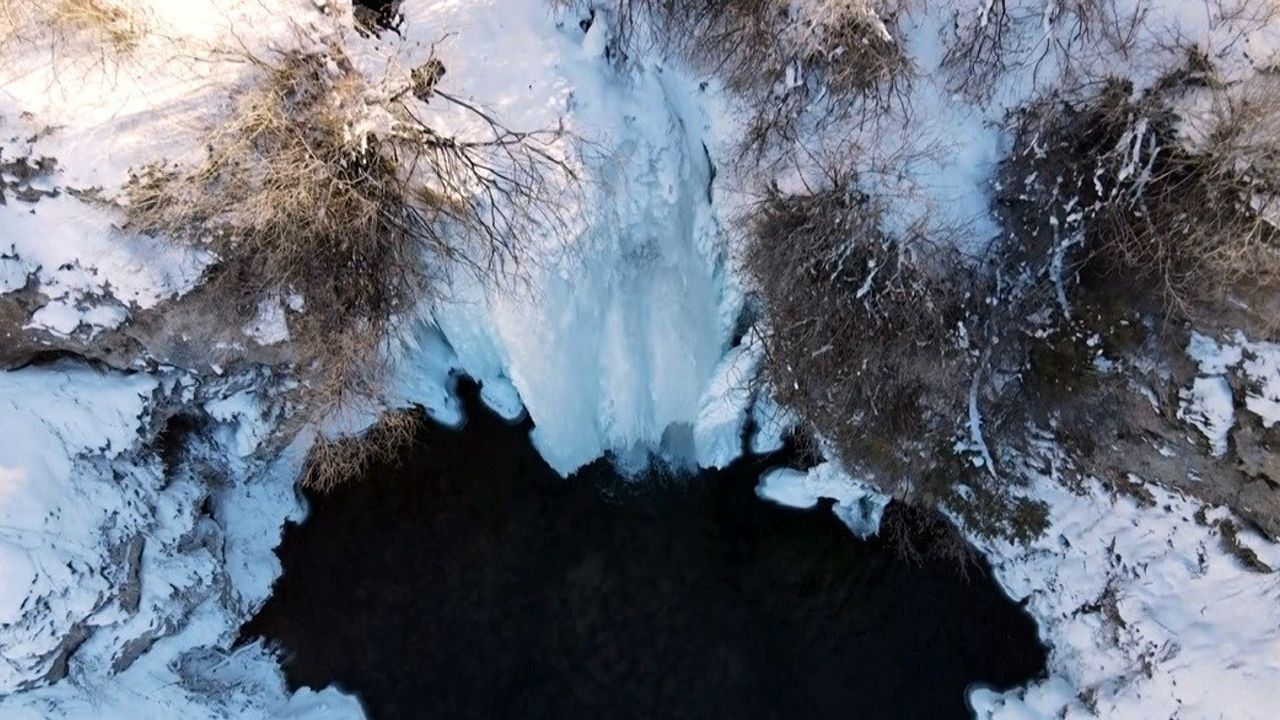 Hava sıcaklığının eksi 20 dereceye düştüğü Bayburt'ta buz tutan Sırakayalar Şelalesi, manzarasıyla adeta kartpostallık görüntü oluşturdu.
