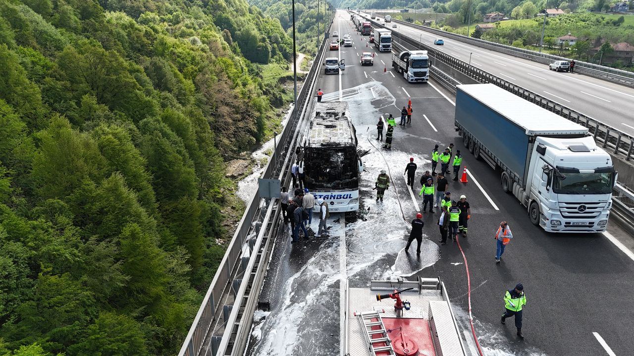 İstanbul istikametine giden Kenan B. idaresindeki, 34 MTC 935 plakalı, içerisinde 33 kişinin bulunduğu yolcu otobüsü, saat 10.00 sıralarında Anadolu Otoyolu'nun Bolu Dağı 1’inci Viyadük mevkisinde motor kısmından alev aldı. Sürücü durumu fark edince otobüsü emniyet şeridine park edip, yolcuları tahliye etti. Büyüyen alevler tüm otobüsü sardı. İhbarla olay yerine gelen itfaiye ekipleri, yangını söndürdü. Otobüs kullanılmaz hale gelirken, yolcular başka bir araçla yollarına devam etti. Yangınla ilgili soruşturma başlatıldı. (DHA)