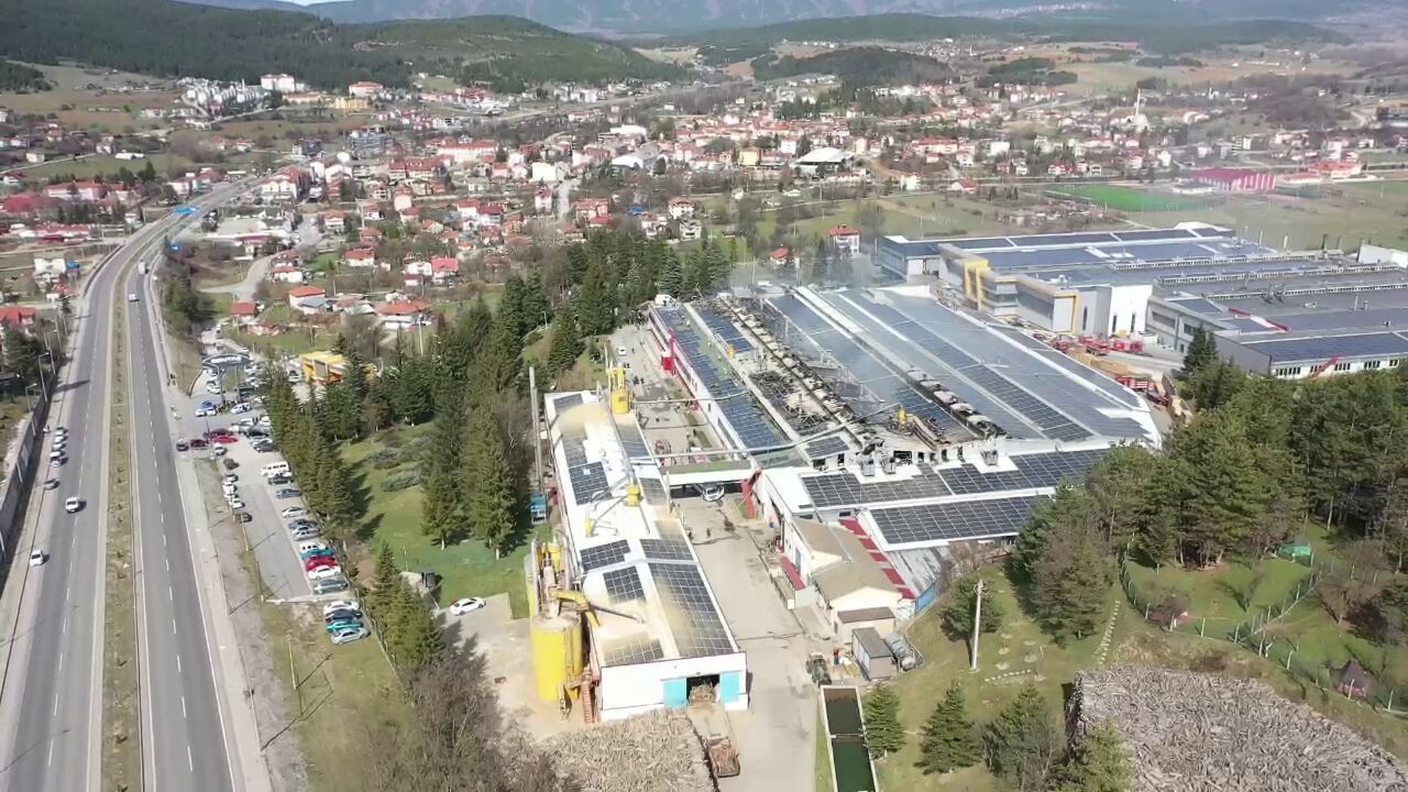 Bolu'da, 1,5 saatlik çalışma sonucu kontrol altına alınan kereste fabrikasındaki yangını soğutma çalışmaları sürerken, oluşan zarar dronla havadan görüntülendi. (DHA)