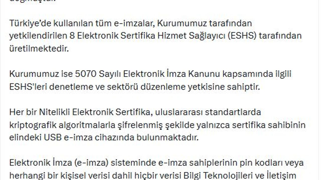 Türkiye'de bulunan tüm e-imzalara ait bilgilerin, toplu halde herhangi bir veri havuzunda barındırılmadığı vurgulanarak, "Bilindiği üzere, siber güvenlik alanında yanıltıcı ve yanlış bilgilerin yayılması, toplumda endişe, korku ve panik oluşturma potansiyeli taşımaktadır. Ayrıca elektronik imza gibi Türkiye'nin dijital sistemlerinin temelini oluşturan ve güven hizmeti olarak adlandırılan bu hizmetlerin güvenirliğini sarsıcı nitelikte algı yaymak, toplumda yıkıcı etkilere sahip olmaktadır. Bu tür eylemler, 7545 sayılı Siber Güvenlik Kanunu kapsamında suç teşkil etmektedir. Kanunun 16'ncı maddesinin 5'inci fıkrasında açıkça belirtildiği üzere; 'Siber uzayda veri sızıntısı olmadığını bildiği halde halk arasında endişe, korku ve panik yaratmak ya da kurumları veya şahısları hedef göstermek amacıyla siber güvenlikle ilgili veri sızıntısı olduğuna yönelik gerçeğe aykırı içerik oluşturanlara veya bu maksatla bu içerikleri yayanlara iki yıldan beş yıla kadar hapis cezası verilir.' Bu bağlamda, e-imza kullanıcılarını hedef göstererek ve kamuoyunu yanıltarak gerçek dışı veri sızıntısı iddialarını yayan, 2 milyon 500 bin üzerinde e-imza kullanıcısını asılsız haber ve paylaşımlar ile endişeye sürükleyen kaynaklar hakkında suç duyurusunda bulunulmuş ve yasal süreç başlatılmıştır" denildi. (DHA)