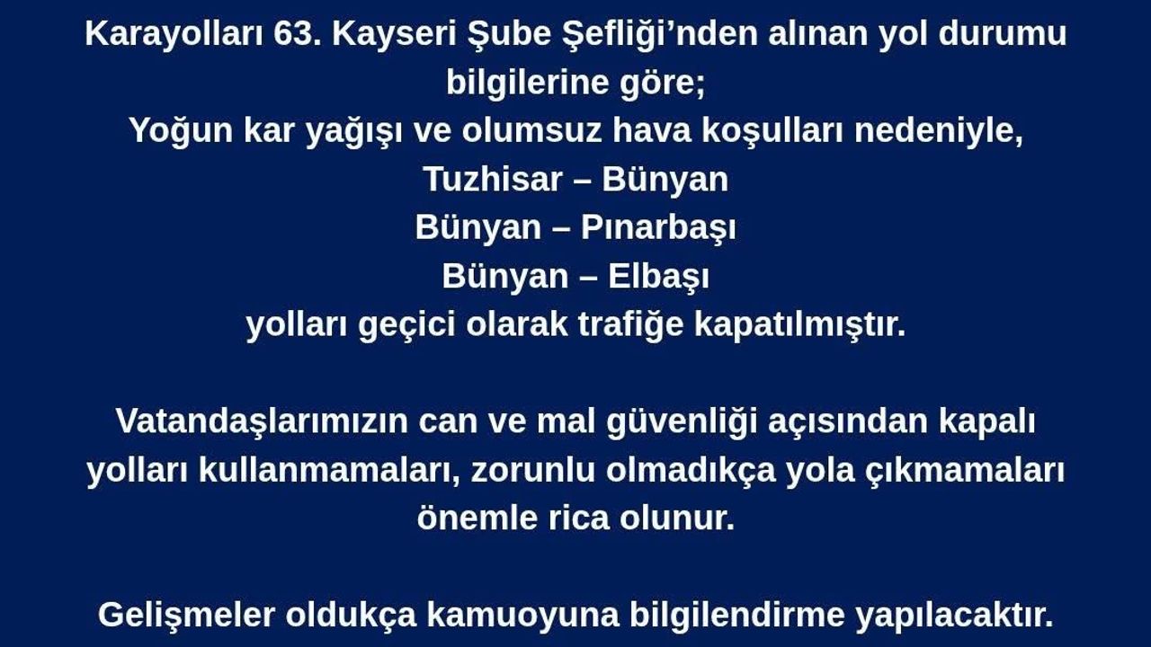 Başkan Selahattin Metin açıklamasında; 'Karayolları 63. Kayseri Şube Şefliği'nden alınan yol durumu bilgilerine göre yoğun kar yağışı ve olumsuz hava şartları nedeniyle Tuzhisar - Bünyan, Bünyan - Pınarbaşı, Bünyan - Elbaşı yolları geçici olarak trafiğe kapatılmıştır. Vatandaşlarımızın can ve mal güvenliği açısından kapalı yolları kullanmamaları, zorunlu olmadıkça yola çıkmamaları önemle rica olunur' ifadelerini kullandı.