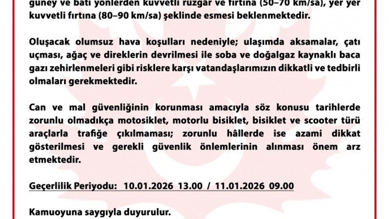Valilikten yapılan açıklamada, 10-11 Ocak 2026 tarihleri arasında il genelinde rüzgârın 50-70 kilometre/saat hızla kuvvetli rüzgâr ve fırtına şeklinde, yer yer ise 80-90 kilometre/saat hızla kuvvetli fırtına olarak esmesinin beklendiği ifade edildi.