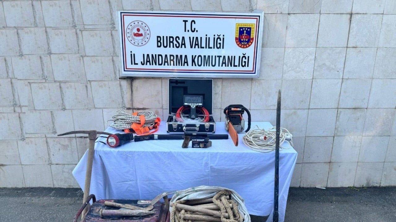 Bursa İl Jandarma Komutanlığı’na bağlı ekipler, 16 Nisan Çarşamba günü Gemlik ilçesine bağlı Cihatlı Mahallesi’nde devriye görevi sırasında zeytin bahçesinde 4 kişinin kazı yaptığını fark etti. Define bulmak amacıyla kaçak kazı yaptığı belirlenen Y.A., A.U., Ö.Y. ve H.Y. gözaltına alındı. Şüphelilerin kazıda kullandığı 1 kamera ve kameraya bağlı tespit çubuğu, 1 jeneratör, 1 odun kesme testeresi, 1 15 tonluk kriko, 1 el feneri, 1 manivela, 1 kazma, 1 tahra, 1 adet tahta çapa, 3 demir murç, 15 metre kablo düzeneği, 25 metre tahta halat merdiven düzeneği, Y.A.’nın üstünden seri numarası olmayan 1 tabanca, 1 tabancaya ait şarjör, 20 adet 9 mm çapında fişek ele geçirildi.