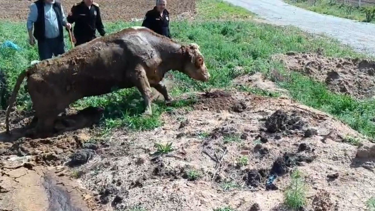 Osmangazi Mahallesi Kuş Konmaz mevkisinde, İsmail Yöndemli'ye ait inek, bataklıktan geçerken çamura battı. İneğinin boynuna kadar battığını gören Yöndemli, hayvanı kendi imkanlarıyla çıkaramayınca itfaiyeden yardım istedi. Bölgeye sevk edilen itfaiye ekibi, boynuna halat bağladıkları ineği çekip kurtardı. Yara almayan inek, sahibi tarafından ahıra götürüldü. (DHA)
