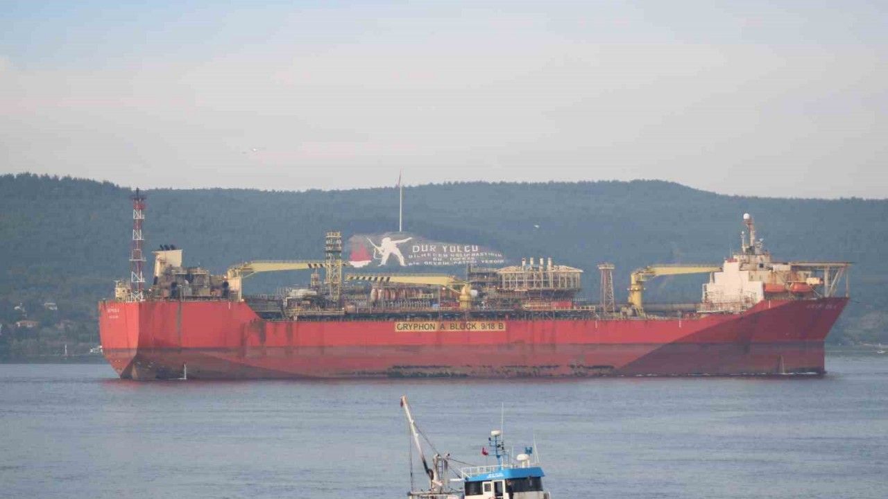 İngiltere’den Yalova’ya gitmek üzere yola çıkan ve dev bir FPSO, yani yüzer üretim, depolama ve boşaltma gemisi olarak hizmet veren ‘GRYPHON A’ isimli gemi, Çanakkale Boğazı güneyinden saat 08.45’te geçiş yaptı. Devasa boyutları ve üretim kapasitesiyle dikkat çeken gemi, boğazdan geçişi sırasında vatandaşların ilgisini çekti.