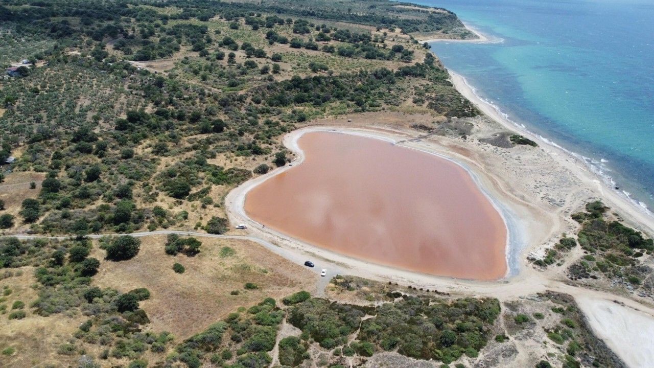 Dalyan köyünde bulunan, Alexandria Troas Antik Kenti zamanında iç liman olarak kullanılan kalp şeklindeki göl, dünyadaki 8 pembe gölden birisi olarak gösteriliyor. Yılın sadece belli dönemleri pembe rengini alan ve sosyal medyada yayılan fotoğraflar nedeniyle popüler hale gelen göl, ziyaretçilerin uğrak noktası oluyor. Sıcaklık ve tuzluluğun artmasından dolayı 'Dunaliella salina' adlı mikroskobik bitkisel canlının fazla üremesinden kaynaklı yaşanan pembe ve kırmızıya yakın tonlar, göle farklı bir görünüm kazandırıyor. Bu yıl ise mayıs ayının sonlarında pembe renge bürünen göl, dronla havadan görüntülendi. (DHA)