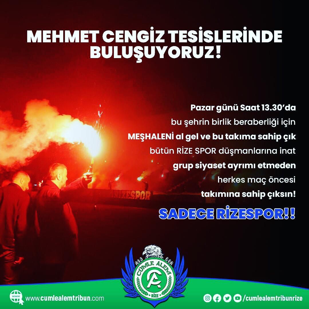 Maraton tribününden 90 dakika takıma destek veren Cümle Alem grubu, yeşil mavi renklerine gönül verenleri Pazar günü 13.30 tesislerin önüne davet etti. Mehmet Cengiz Tesisleri’nde buluşuyoruz başlığı ile paylaşım yapan Cümle Alem grubu:” Pazar günü saat 13:30’da bu şehrin birliği için Meşaleni al gel ve bu takıma sahip çık. Bütün Rizespor düşmanlarına inat grup, siyaset ayırt etmeden herkes maç öncesi takımına sahip çıksın. Sadece Rizespor” dedi.