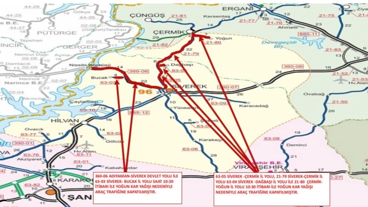 Diyarbakır'ın Çermik ilçesi ile Şanlıurfa'nın Siverek ilçesini bağlayan yol, yoğun kar yağışı nedeniyle ulaşıma kapandı.