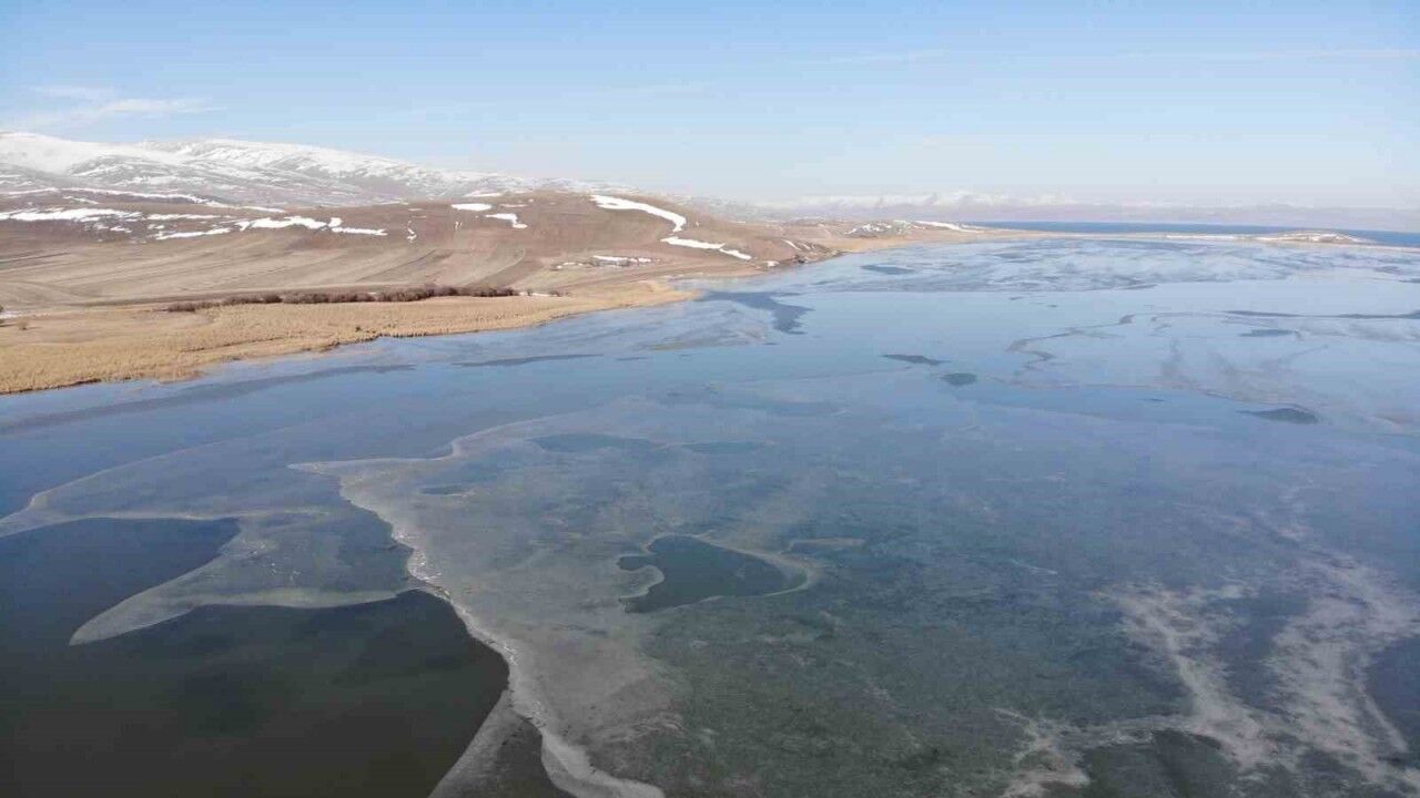 Doğu Anadolu Bölgesi`nin Van Gölü`nden sonra 2’inci büyük gölü olan Çıldır Gölü`nün yüzeyi soğuk hava nedeniyle kısmen dondu.