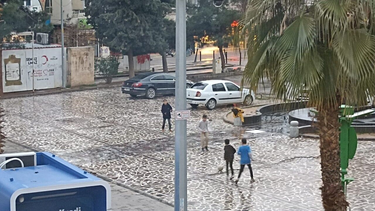 Kızıltepe ilçesinde etkili olan yağmur nedeniyle Cumhuriyet Meydanı’nın bir kısmı suyla doldu. Yağmurun dinmesinin ardından top oynamak isteyen çocuklar, çevredeki esnaftan aldıkları çekpaslarla suyla dolan alanı temizledi. Temizliğin ardından çocuklar top oynarken, yaşananlar cep telefonu kamerasıyla görüntülendi. (DHA)